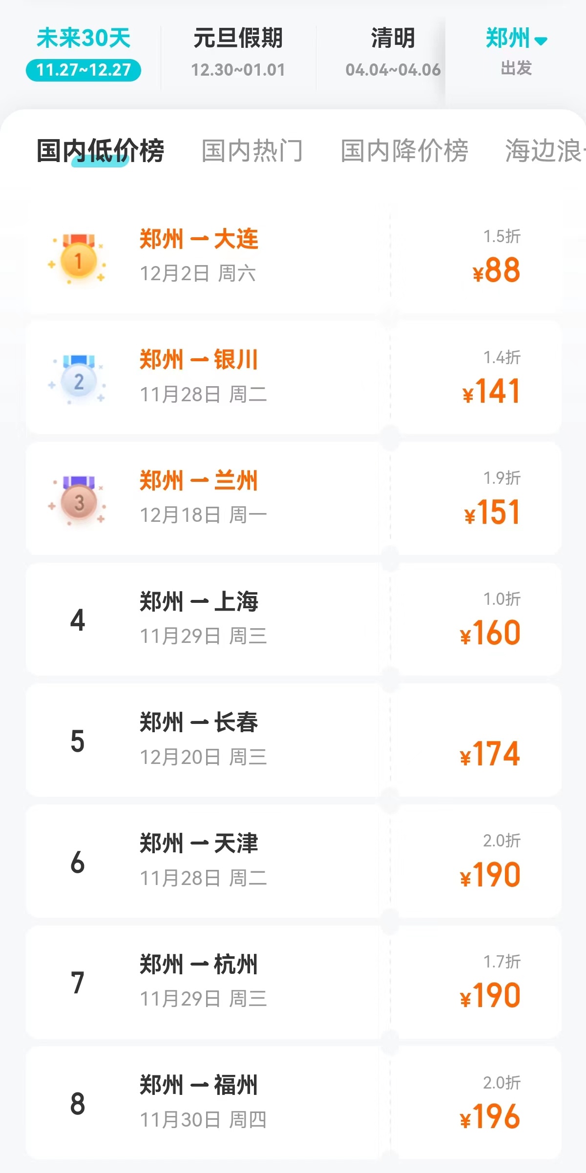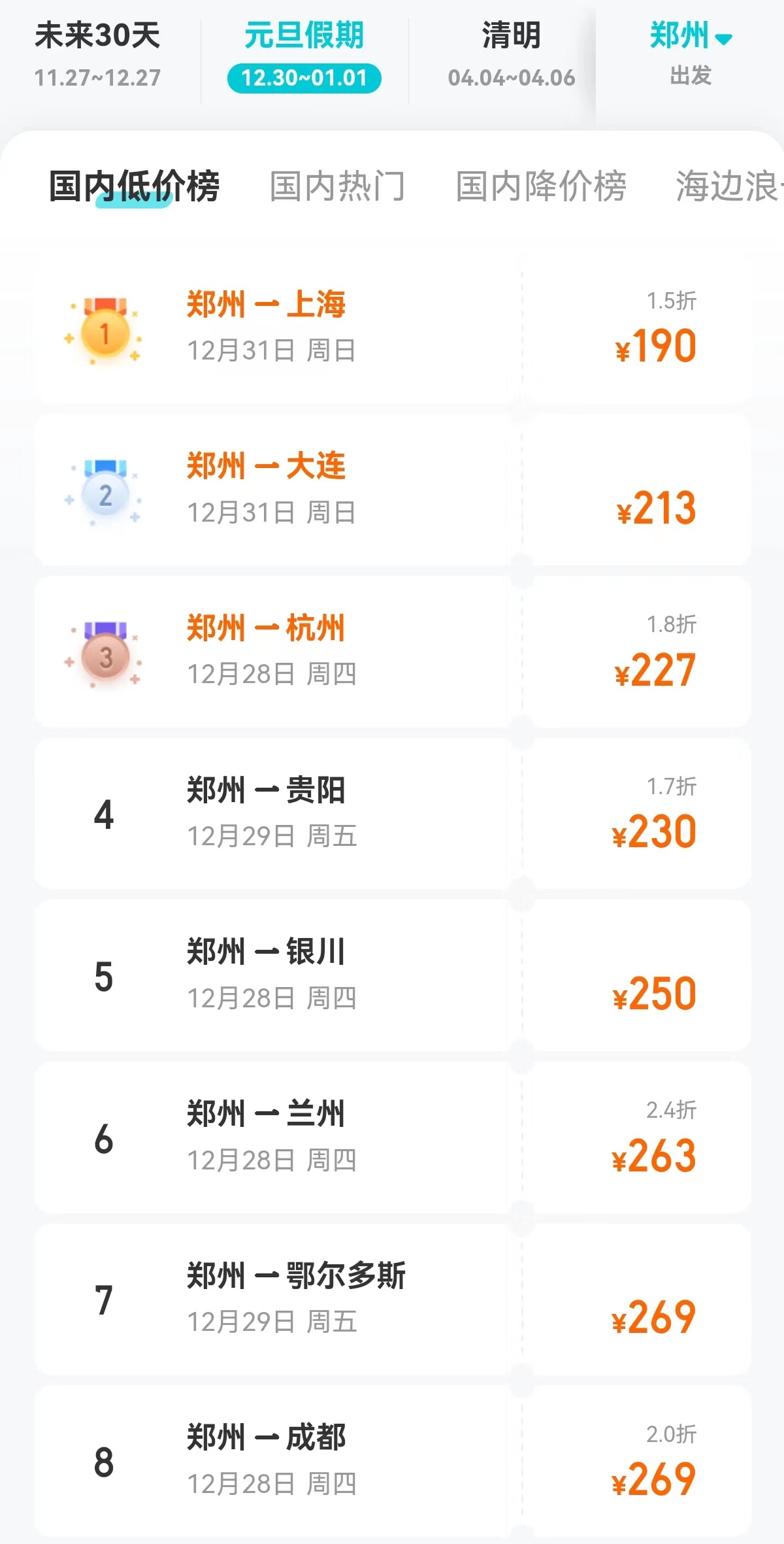 而隨著2023年即將進入12月,已有不少游客開始計劃2024年元旦小長假出游,從機票價格來看,12月28日~31日,鄭州出發(fā)直飛上海、大連、杭州、貴陽、銀川、蘭州、鄂爾多斯、成都的機票價格位列低價榜TOP 8,基本價格區(qū)間在200元左右。因此,從平臺預訂和機票價格浮動情況來看,無論是日常通勤,還是冬季出游,乘坐飛機將成為省時又省錢的不錯選擇。