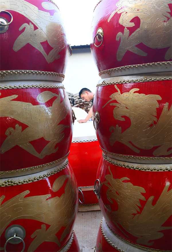 2023年11月25日,河南省焦作市孟州市河陽(yáng)街道緱村喬家鼓坊的大院內(nèi),喬家制鼓第三代傳人喬伯文正在為大鼓刷漆。院子里、倉(cāng)庫(kù)里,擺放著各式各樣的鼓。“臨近年底,訂單源源不斷,一天也不敢歇。”喬伯文邊忙活邊說(shuō)。