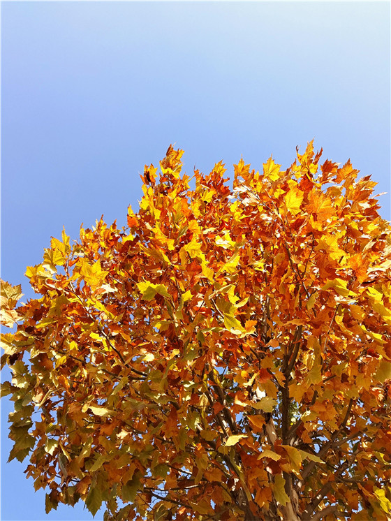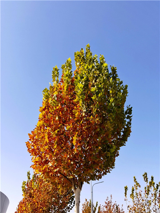 隨著2023年步入冬季,氣溫快速下降,河南省鄭州市的法桐樹葉開始呈現(xiàn)出鮮艷的色彩,有的青綠,有的橙紅,有的金黃,在枝頭交相輝映。作為鄭州最常見的樹種之一,法桐讓整個(gè)城市進(jìn)入“黃金”時(shí)間。
