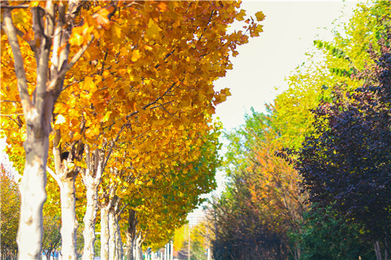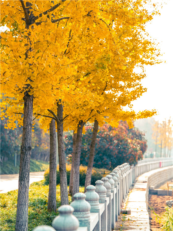 公園旁邊的銀杏樹在夕陽的余暉中熠熠生輝 徐聰 攝