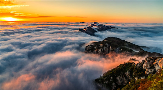 云海磅礴,如滔滔江海般,淹沒了遠(yuǎn)處的山巒。