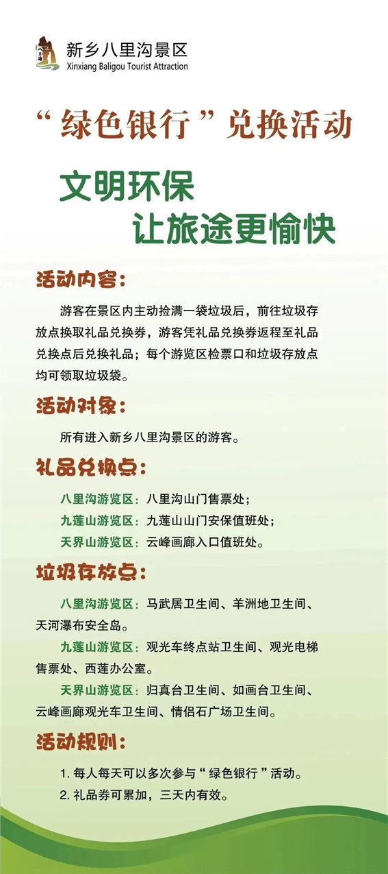 今年4月份,新鄉(xiāng)南太行八里溝景區(qū)創(chuàng)新開展了“綠色銀行”垃圾兌換活動,鼓勵游客主動撿垃圾并帶出景區(qū),將垃圾的“末端清掃”變?yōu)?ldquo;源頭減量”,將“景區(qū)包攬”變?yōu)?ldquo;人人參與”。