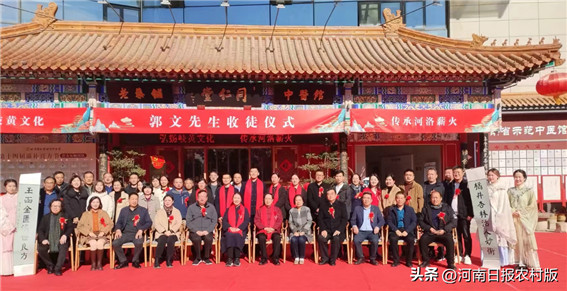 收徒儀式環(huán)節(jié),郭文先生及其夫人張玲老師上堂端坐,王林霞、李省魁、楊一博、王鶯、馬津辰等五位弟子敬獻鮮花,齊聲宣讀拜師帖,敬呈拜師帖,行拜師禮,敬奉謝師茶,弟子共同鞠躬表達對郭文老師的敬意。