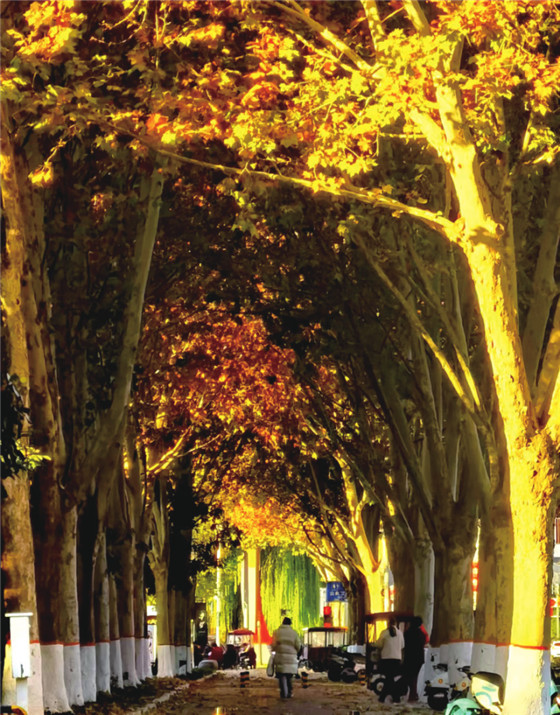 樹(shù)影婆娑,光影斑駁,落日余暉匯成了氛圍感“美拉德”,映射在臺(tái)階上、樹(shù)叢中,“濃厚”了歲月感。