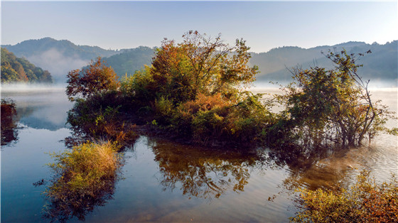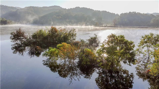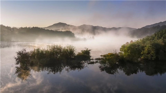 圖為湖光山色薄霧繞。 徐生祥 攝