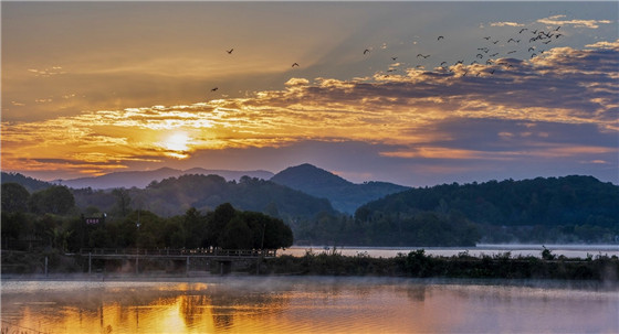湖面映朝霞,飛鳥舞晴空。 徐生祥 攝