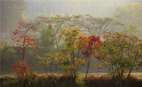 初冬時節(jié)的信陽市新縣,晨霧薄如輕紗,陽光穿透云霧,幻化出朦朧的暖色。樹影婆娑、光影斑駁,宛若一幅絕美油畫。