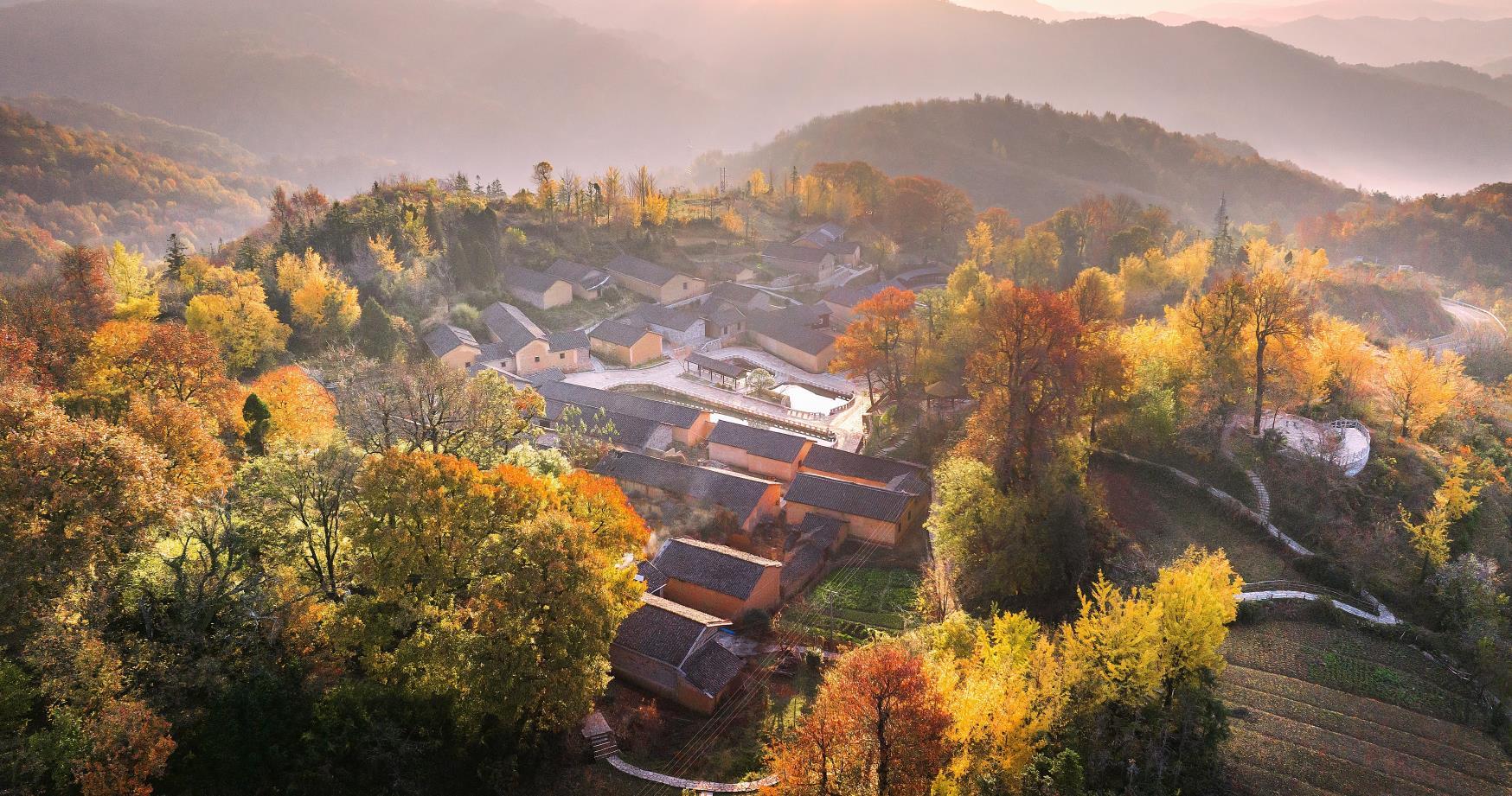 初冬晴日,晨光緩緩暈染山巒。坐落在河南省信陽市新縣香山湖國家濕地公園旁邊的韓山古村落,正在傾瀉而下的暖陽中蘇醒。