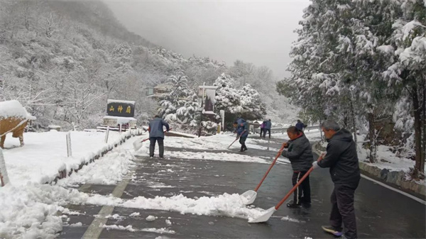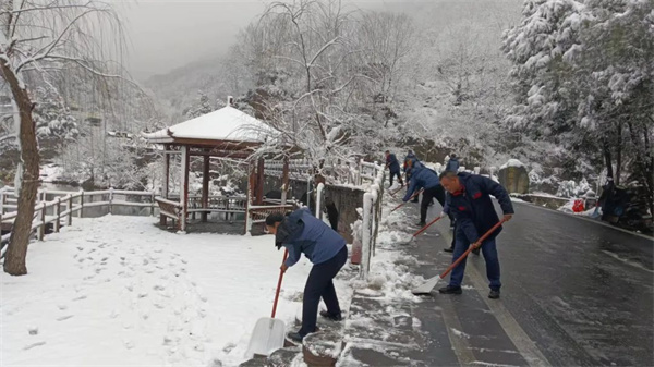 大雪將山巒峰谷銀裝素裹,景色頗為壯觀。但持續(xù)的降雪也給通行帶來了困難,景區(qū)領(lǐng)導(dǎo)帶頭組織員工頂嚴(yán)寒、冒大雪開展掃雪除冰行動(dòng)。確保景區(qū)道路暢通,重要設(shè)施設(shè)備安全運(yùn)行,保障各項(xiàng)工作正常開展。