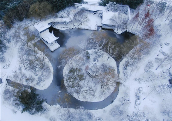大雪過后的綠博園,樹木被積雪裝點,色彩斑斕的亭臺樓閣,在銀色外衣的裝扮下顯得格外大氣耀眼,楓葉在雪的映襯下,更顯得紅艷欲滴,似一幅淡雅的水墨畫,呈現(xiàn)獨特韻味。