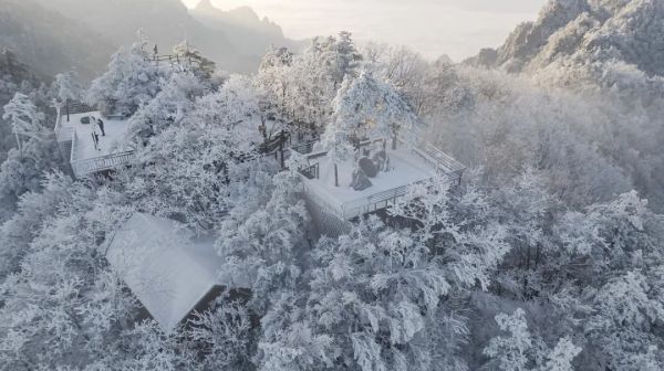 山川、松柏、灌木和怪石上都覆蓋上了一層厚厚的積雪,放眼山巔,雪色彌漫,處處都是絕美的景致。