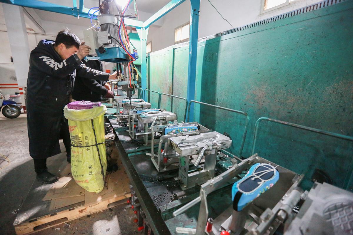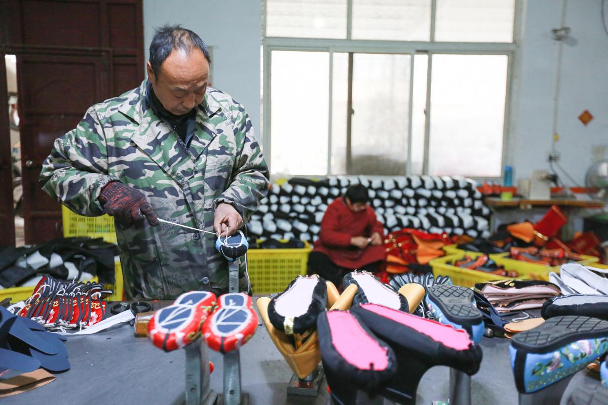 霍軍政為村民們作了轉(zhuǎn)型示范。早年間,霍軍政曾在“中國(guó)鞋都”溫州打拼,回村從事社火生產(chǎn)時(shí),主要生產(chǎn)戲鞋、戲靴。他引入機(jī)器制鞋生產(chǎn)線,同時(shí)采用人工流水線配合機(jī)器生產(chǎn),顯著提高了生產(chǎn)效率。
