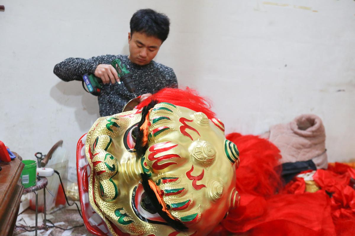 上色、粘睫毛、固定耳朵,歷經(jīng)17道工序,一只活靈活現(xiàn)的獅子躍然眼前;粼讫埥衲23歲,是個(gè)標(biāo)準(zhǔn)的“00后”,從事家傳的社火生意,接受采訪時(shí),他正坐在一堆半成品的獅頭和布料中間。“我沒(méi)專門學(xué)過(guò)做獅子的手藝,從小看爺爺做,看都看會(huì)了。”霍莊村各家有各家的產(chǎn)品,霍云龍家只做獅子,一年能賣四五十萬(wàn)元。