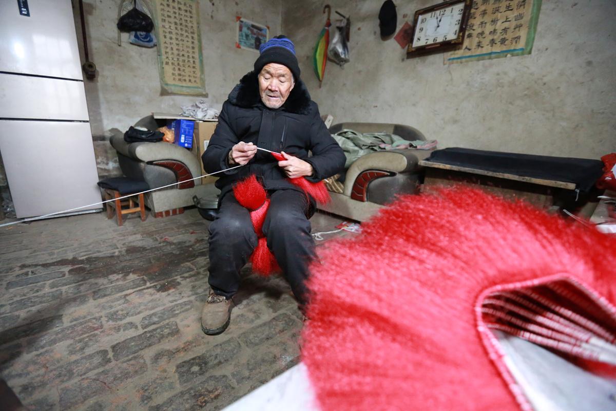 兩根鐵條、一根棉線、一把紅絲絨,在手中撥捻穿插,一會(huì)兒功夫就變成了一件戲曲人物佩戴的髯口。今年76歲的霍秉森是制作髯口的老手,他說(shuō):“老了,手頭兒沒(méi)以前麻利了,現(xiàn)在一天能做七八件。”別家提供材料,霍秉森在家加工,一天能掙幾十元。