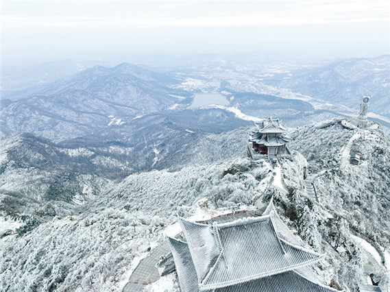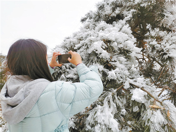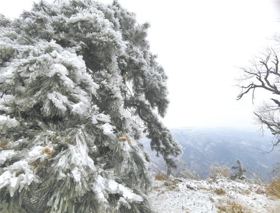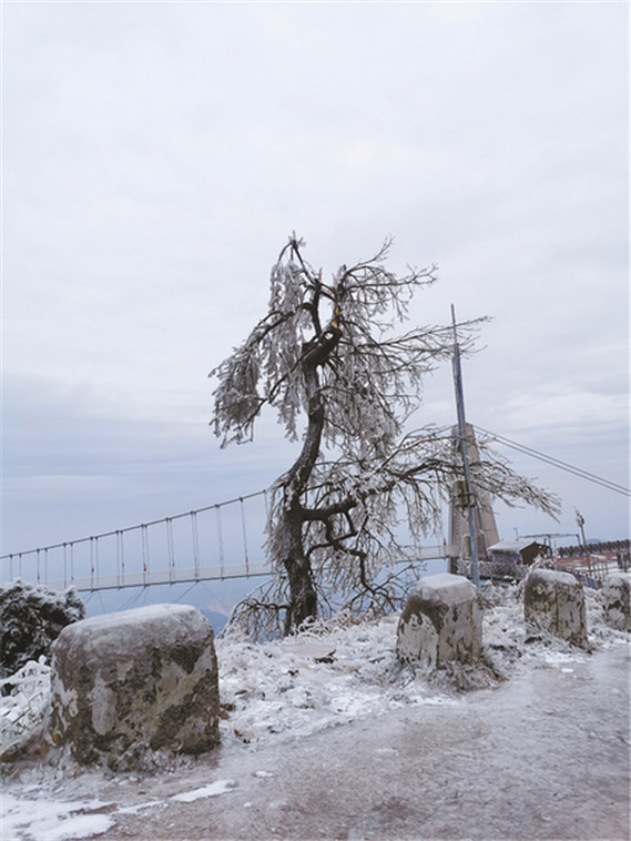 2023年12月18日,記者在河南省駐馬店市老樂(lè)山看到,滿眼都是銀裝素裹的景象,猶如仙境一般,美不勝收。遠(yuǎn)處漫山遍野的樹(shù)木被霧凇包裹,十分壯觀,讓人流連忘返。