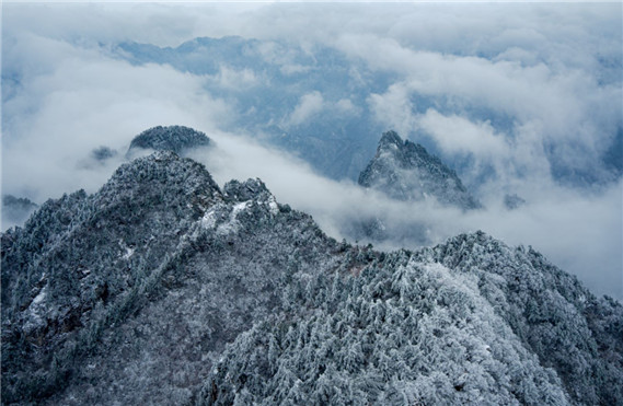 當穿流的云霧匯聚成海時,波瀾壯闊的云海便自山間升騰而起,云瀑自高處流瀉而下,沖進了那片片霧凇林中,白云山的冬季盛景,云海霧凇便形成了,此時天地茫茫,俯仰皆是云白雪色,讓人沉醉其中。