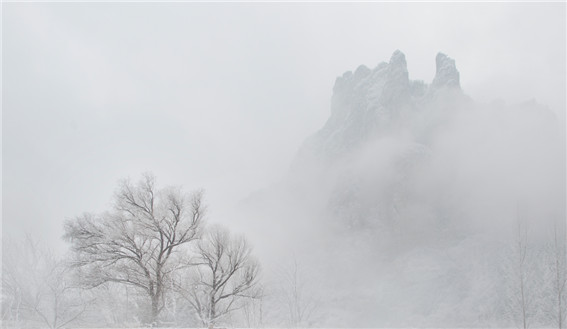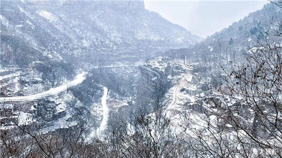 站在太行天路上,景色也跟著壯闊起來,黑的山,白的雪,在蒸騰的霧色里隱約可見,一幅幅水墨畫映入眼簾。