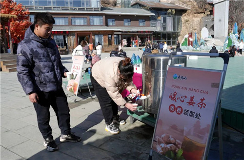 同時(shí),景區(qū)還在中天門廣場現(xiàn)場熬制暖心姜茶,免費(fèi)送至游客手中,為游客驅(qū)寒取暖。
