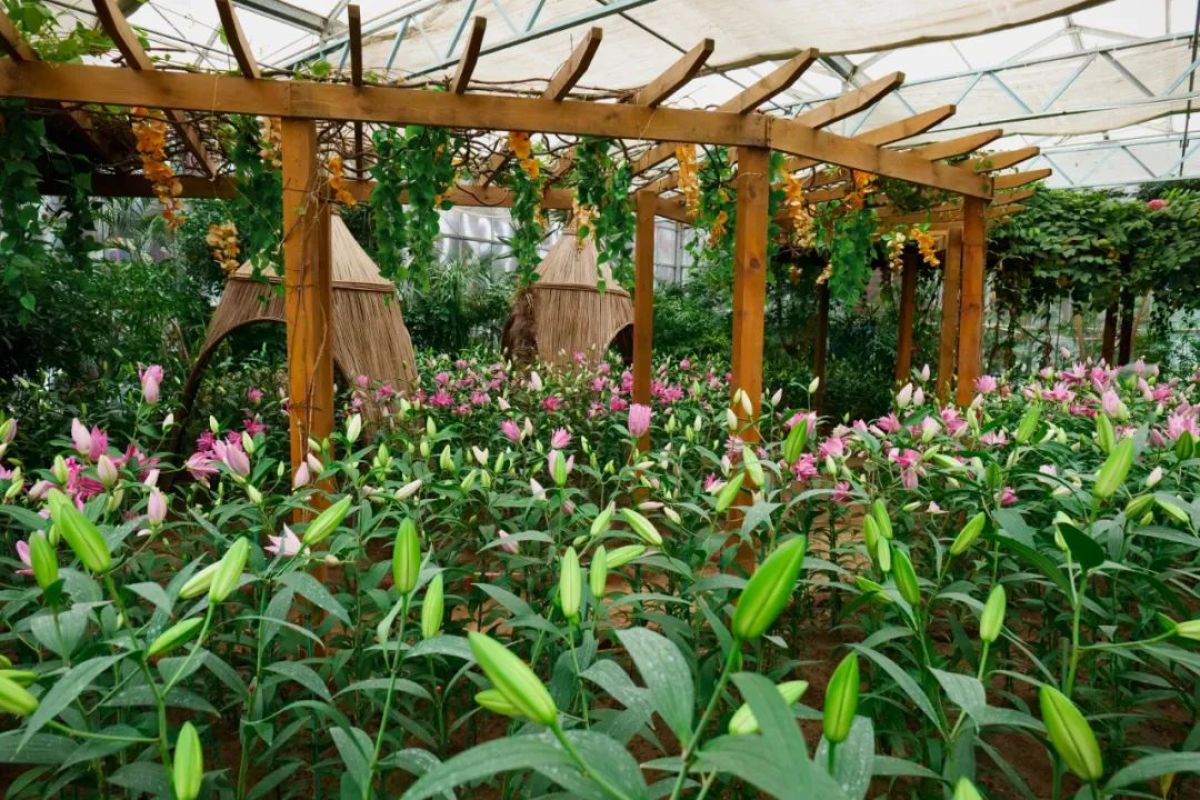 4000平米的智能溫室內(nèi),共展出30余種、3萬(wàn)多株的百合花。木門、索邦、紅成功、彩虹、豐收等多個(gè)品種,花姿雅致,花香馥郁。今年新種植的“豐收”為重瓣百合花,由人工雜交選育而來(lái),可以說(shuō)是專為觀賞而生的,以花型重瓣而得名,花大色美,花香怡人,是百合花界的新貴。