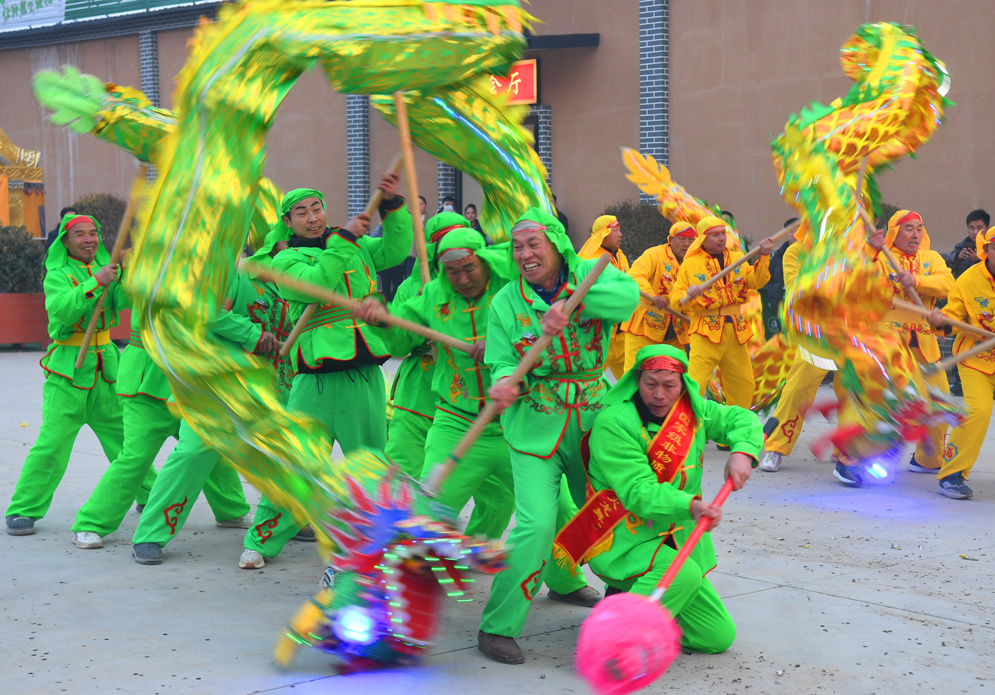 火龍舞由龍臺村村民表演,分別有紅、藍(lán)、綠、黃、白五條火龍,每條火龍龍口設(shè)置噴火裝置。表演時,五色彩龍上下翻飛,不斷變換造型,并且龍口噴出火焰,在夜幕中光彩奪目。