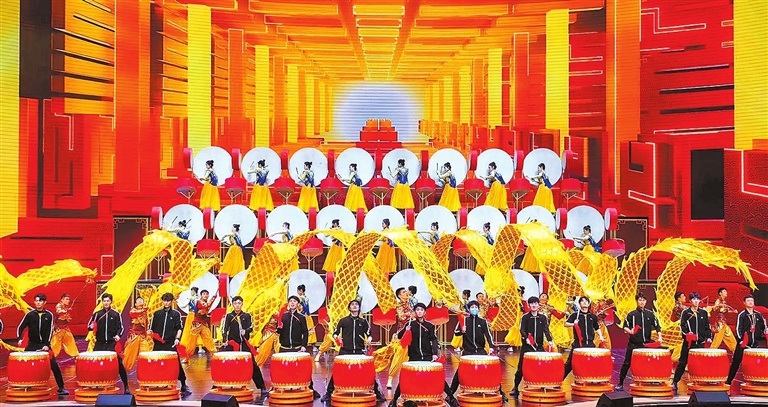 開場節(jié)目《鼓舞龍騰》,伴隨著渾厚激昂、奮進向上的陣陣鼓聲,塔溝武校45名學(xué)員操控的金龍最為引人矚目。展開長達8米的金黃色巨龍,結(jié)合武術(shù)雙鞭創(chuàng)新出來的雙龍表演,大氣磅礴又帶著一絲靈動。一時間,云起龍驤、欣欣向“龍”,一派活力磅礴、吉祥如意的盛世景象躍然于舞臺之上。