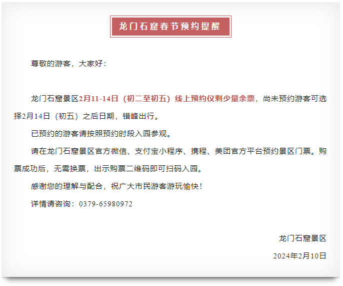 龍門石窟春節(jié)預約提醒!