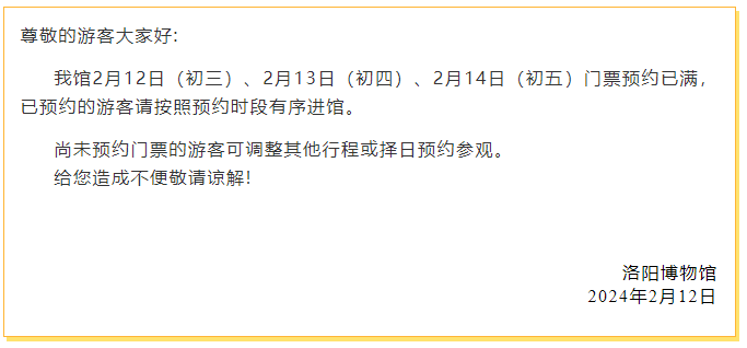洛陽(yáng)博物館關(guān)于2月12日(初三)、2月13日(初四)、2月14日(初五)預(yù)約已滿!