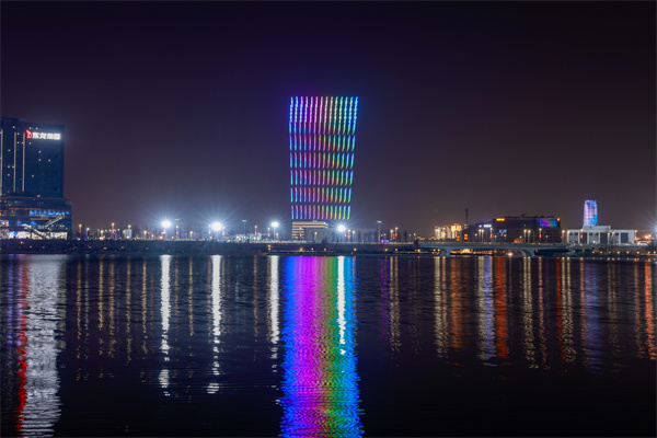 無人機(jī)組成“彩虹大道”從湖畔起飛
