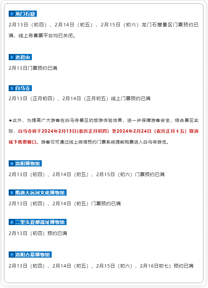 面對(duì)“人從眾”模式,洛陽熱門景區(qū)及時(shí)發(fā)布限流公告。截至目前,洛陽這些景區(qū)、博物館發(fā)布最新提醒👇👇👇