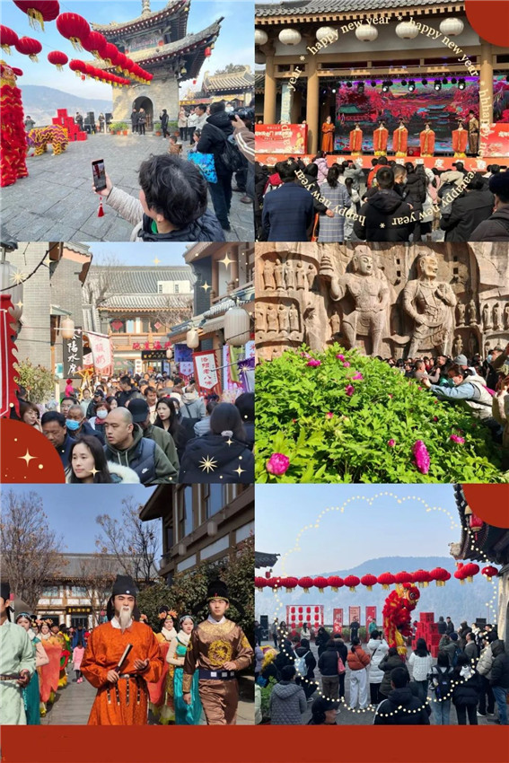 創(chuàng)意飛揚(yáng)的活動(dòng)、精彩紛呈的演藝、千年文化的匠心傳承……多元化的文旅體驗(yàn)新場景吸引全國游客奔赴至此,開啟一個(gè)元?dú)鉂M滿、充滿活力的精神龍年!央視關(guān)注點(diǎn)贊、多家省級媒體聚焦、文章視頻齊上陣,氣象萬千的古韻龍門備受追捧,頻頻出圈,驚艷世界。成功策劃并舉辦了“龍年游龍門·祈福度新春”主題系列活動(dòng),豐富游客游園體驗(yàn)。“龍鯉云集 龍門大集”古街集市開街,遍布龍門古街、景區(qū)入口等位置的龍門“打卡點(diǎn)”,冬日綻放在奉先寺上的牡丹花,神圣又充滿儀式感的“盛世新年·香山撞鐘”活動(dòng),大詩人白居易“穿越”回現(xiàn)代與游客在龍門古街和香山寺偶遇……龍門石窟“花式”迎龍年,游客沉浸享春節(jié),處處洋溢著新春歡樂祥和的喜慶氛圍。