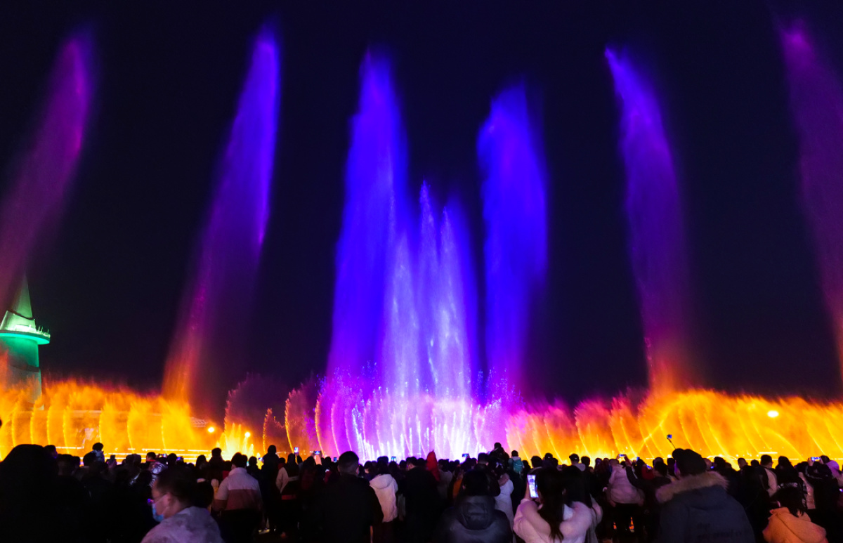 還有舞龍、麒麟舞、川劇變臉輪番上演,高蹺、旱船、雜技噴火熱火朝天,為游客貢獻了精彩的“年味”,贏得游客一眾好評。閃爍的麥穗、發(fā)光的郁金香以及火紅耀眼的楓葉,迷人的花朵在夜空中綻放,恢宏大氣的音樂噴泉在綠博園楓湖翩翩起舞,水柱伴隨著旖旎的燈光絢麗翻轉,仿佛化身曼妙的舞蹈演員正在舞臺盡情表演,吸引游客紛紛拿出手機拍照攝像,不時傳來歡呼聲。