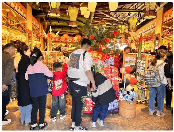 銀基動物王國內(nèi)最大的綜合文創(chuàng)店佳寶集市商店這個春節(jié)的生意格外火爆。根據(jù)銀基璨樂文化創(chuàng)意有限公司負責人介紹,春節(jié)假期,度假區(qū)內(nèi)文創(chuàng)周邊熱銷商品13.7萬件。“其中我們自有原創(chuàng)設計商品占到70%,節(jié)前我們與動物星球聯(lián)名開發(fā)了以夢幻動物園內(nèi)的白虎、獅子、棕熊和狼王為原型的盲盒手辦,一經(jīng)推出就特別受歡迎,我們自己設計開發(fā)的動物主題棒球帽、豆丁尾巴、趴趴動物徽章趴肩公仔、水豚周邊等與我們園區(qū)內(nèi)網(wǎng)紅動物相關(guān)的周邊商品售賣情況也都很好。”