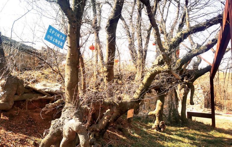 一聽是來看古樹的,一名年輕人主動帶著記者去尋找。順著山間小路向北,很快找到了這片“森林”:十幾株粗樹擠在一起形成一片小樹林,東西長約20米,最西側(cè)那株樹最粗。走近看,只見樹的根部連在一起,從西向東像一條古怪的蒼龍。龍頭在西邊向上揚(yáng)起,向東是龍身,一直延伸到東邊的水溝處,10多株皂角樹形成了一個(gè)小樹林。