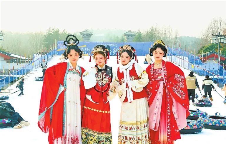 2月18日,一場與雪的共舞在永城芒碭山旅游區(qū)漢梁王陵景區(qū)上演。妝容精致的“小姐姐”“小哥哥”身著華美的漢服在這里“打卡”拍照,在近萬平方米的人工雪地上,他們拉雪橇、開“坦克”、爬“雪山”、滑“滑梯”,歡樂徜徉在浪漫的雪景之中。