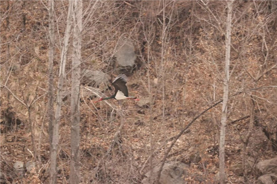 當(dāng)天下午,調(diào)查隊(duì)員沿著白河進(jìn)行調(diào)查時(shí),突然發(fā)現(xiàn)空中有2只黑鸛在空中飛翔,當(dāng)大家準(zhǔn)備拍照、錄視頻時(shí),黑鸛警覺地飛到遠(yuǎn)處消失了。為了弄清楚黑鸛的具體數(shù)量,隊(duì)員們繼續(xù)搜索尋找,走了7公里,看到4只黑鸛正在白河中覓食,不遠(yuǎn)處山上空中有9只在空中飛翔,隊(duì)員們通過認(rèn)真觀察、仔細(xì)辨認(rèn),總共記錄到13只黑鸛。