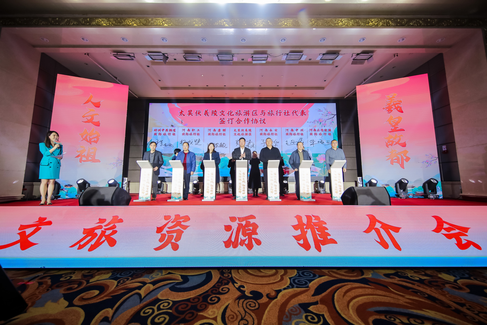 在現場,周口市文化廣電和旅游局與建業(yè)集團簽署文旅合作框架協(xié)議,周口市淮陽區(qū)人民政府與河南省旅游協(xié)會簽署合作框架協(xié)議,太昊伏羲陵文化旅游區(qū)與旅行社代表、西華縣景區(qū)運營公司與旅行社代表簽訂合作協(xié)議,進一步實現合作共贏,攜手助推“道德名城·魅力周口”高質量發(fā)展。