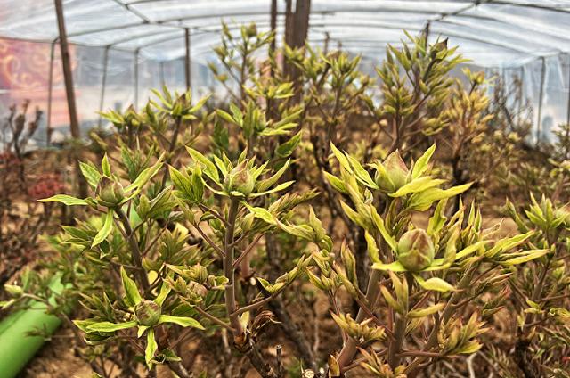 在增溫設備的“暖心”呵護下,大多數(shù)住上“暖氣房”的牡丹已進入立蕾期,而大棚外的牡丹還處于發(fā)芽階段。