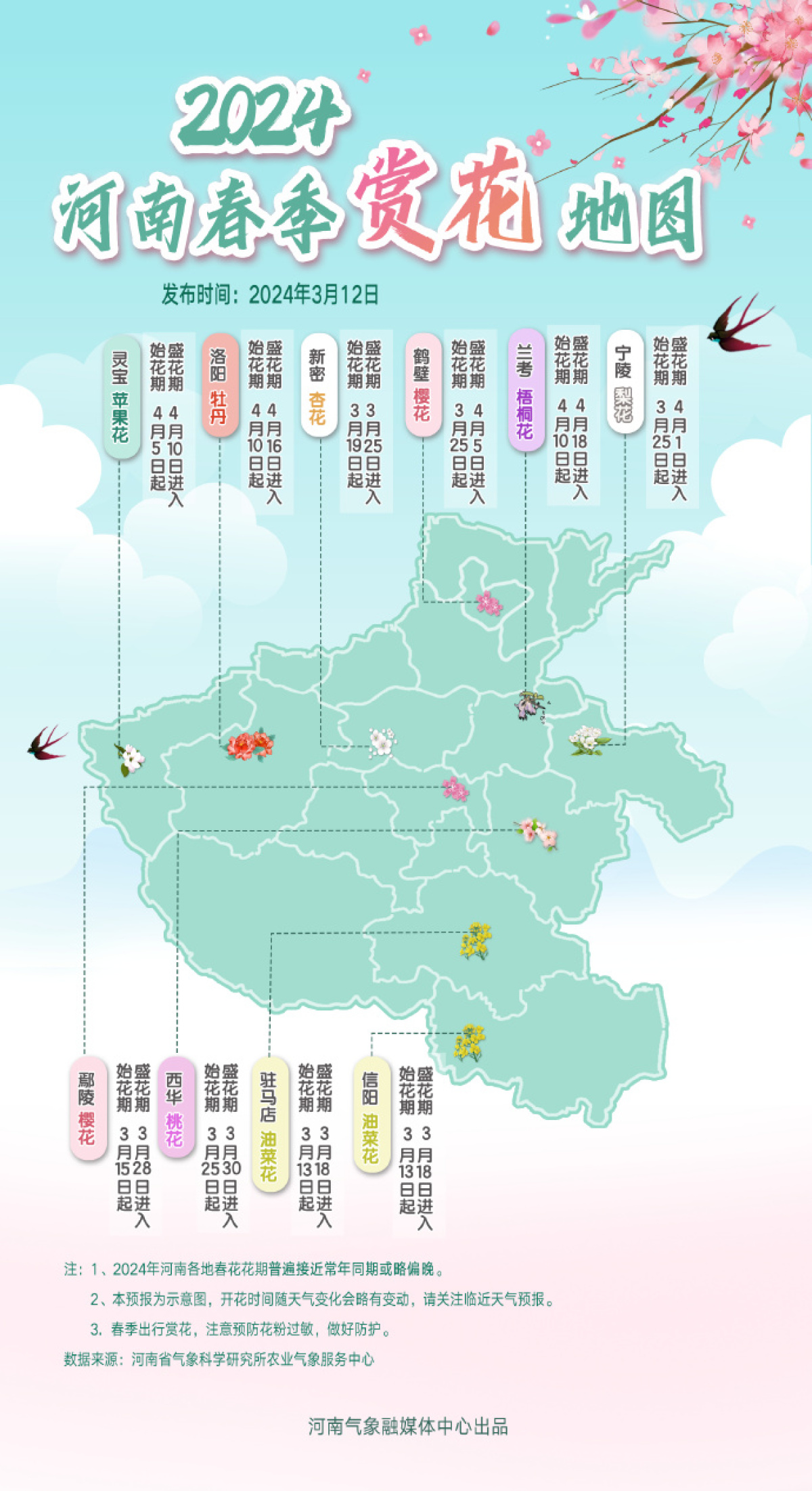 煙花三月,草長鶯飛 。今年2月以來河南省平均氣溫較常年同期偏低,春季植物花期普遍接近常年同期或略偏晚,春花何時(shí)賞?@河南氣象 一張花期預(yù)報(bào)圖安排滴明明白白!