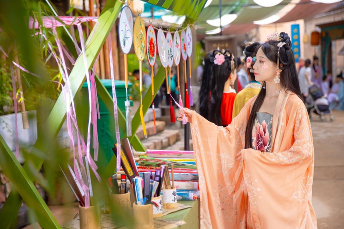 與此同時(shí),三月的建業(yè)電影小鎮(zhèn),太極湖邊柳樹(shù)抽出新枝,各類花朵展開(kāi)花苞,處處春氣萌動(dòng),萬(wàn)物生機(jī)盎然。來(lái)小鎮(zhèn)赴一場(chǎng)春日游園盛宴,觀百場(chǎng)沉浸式演藝,樂(lè)享人間三月天。走進(jìn)穿越換裝館,或優(yōu)雅的旗袍,或溫文爾雅的長(zhǎng)衫,亦或是國(guó)風(fēng)的漢服,游客可以在數(shù)千件服飾中換上自己喜愛(ài)的服裝,穿梭在百年風(fēng)情的電影大道與布滿花燈的太極街區(qū)愜意隨拍。