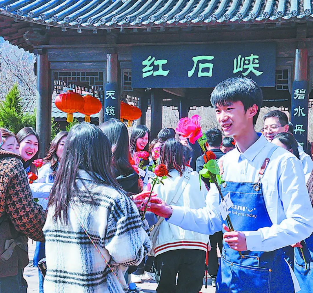 3月8日,云臺山景區(qū)工作人員免費為女性游客發(fā)放玫瑰花,祝她們節(jié)日快樂。
