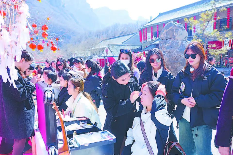 3月8日,云臺山景區(qū)免費為游客化妝、美甲,現(xiàn)場游客紛紛體驗,興趣盎然。