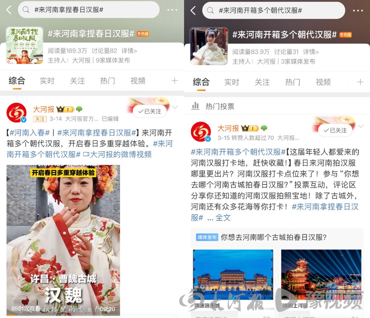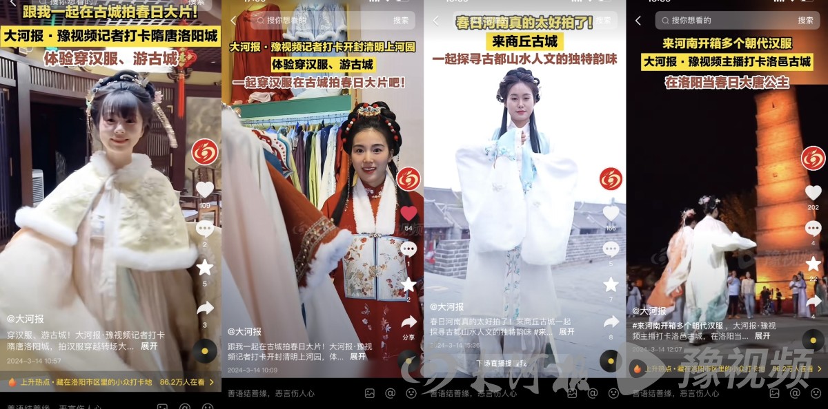 春日河南,漢服飄逸,花海涌動,美食誘人,方言韻味十足。近日,大河報·豫視頻緊扣春日踏青、賞花主題,巧妙結合河南古城、漢服及穿越元素,推出“來河南拿捏春日漢服”大型主題策劃,通過一系列精彩紛呈的活動和報道,在網(wǎng)絡上掀起一股河南文旅熱潮,營造了“春日河南與漢服太配了”的濃厚氛圍。