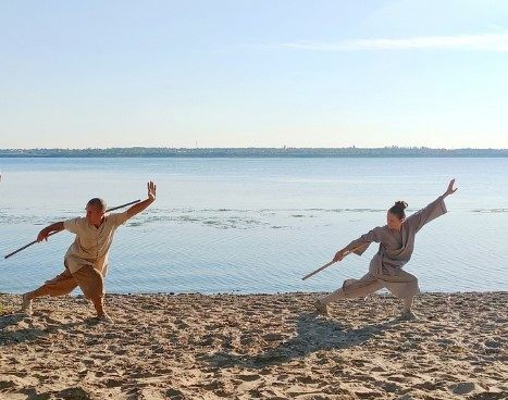 圣彼得堡少林文化中心負責(zé)人釋延夫、釋延濱夫婦在伏爾加河岸邊練習(xí)少林功夫