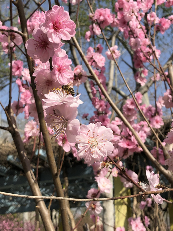大門(mén)北側(cè)和北側(cè),各有一大片桃花正在盛開(kāi),遠(yuǎn)看似一片令人心醉的粉紅云霞,近看除了一簇簇密密層層綻放的粉紅花朵,還有不少紅色的花苞,在青枝綠葉的映襯下煞是嫵媚。