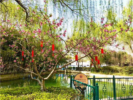 走進(jìn)園內(nèi),主廣場(chǎng)前幾株桃花灼灼開(kāi)放。樂(lè)曲聲中,一隊(duì)身著民族風(fēng)格演出服的舞蹈演員熱情表演著民族舞蹈。幾十個(gè)小朋友一字兒排開(kāi),在地上盡情書(shū)寫(xiě)他們心中的桃花風(fēng)情。