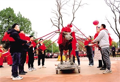 《福牛耕春》,村民們通過改造一尊被閑置的耕牛塑像,生動(dòng)展現(xiàn)了古人春分后的勞作場(chǎng)景,來自中國(guó)社科院考古研究所的專家李永強(qiáng)、企業(yè)界代表與裴李崗村民代表手執(zhí)福鞭,隨著祝詞一起鞭“打春牛”,強(qiáng)烈的現(xiàn)場(chǎng)感引起現(xiàn)場(chǎng)群眾的共鳴。