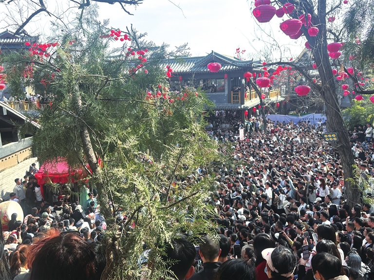 3月21日下午2點,距離“王婆說媒”的演出還有90分鐘,但大宋武俠城里的王婆茶樓前已經(jīng)擠滿了人。