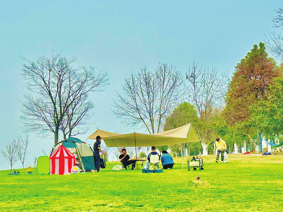 在草坪區(qū)域,有的市民搭起露營帳篷或者天幕帳篷,支起簡易的桌椅,擺放上美味的食物,與親朋好友一起悠閑地欣賞著風(fēng)景、享受著美食;有的市民則帶著孩子放風(fēng)箏、吹泡泡、踢足球,盡情享受春日里美好的親子時光。在網(wǎng)紅小火車、觀光車、仿真恐龍電動車等游樂區(qū)域,孩子們追逐游戲,充滿著歡聲笑語。