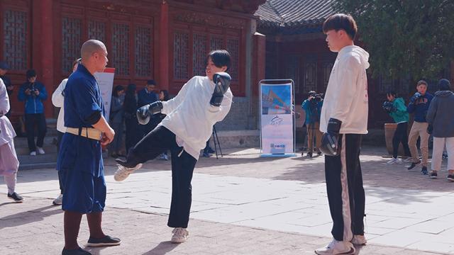 授課環(huán)節(jié),學生們兩兩一組,由四位老師分別手把手教授。“提膝,翻胯、蹬腿,整個身體要拉成一條線。”場地一側,少林武僧細致講授腿法的動作要領。而同時在另一側,兩位法式拳擊世界冠軍耐心地向學生指導法式拳擊的姿勢和技術特點,帶大家嘗試鞭抽式腳擊、勾拳等經典動作。