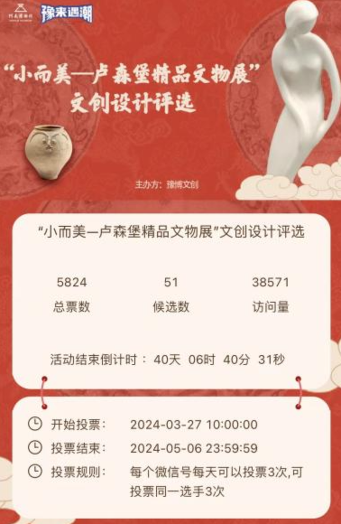 線上活動同樣精彩紛呈,“小而美——盧森堡文物精品展”文創(chuàng)設計評選通道于昨日10:00開啟。經(jīng)過激烈角逐,51 份作品成功入圍決賽。短短幾小時,評選頁面瀏覽量高達 6.3萬余次,投票數(shù)突破10000票,充分體現(xiàn)了公眾對此次活動的高度關注和積極參與。